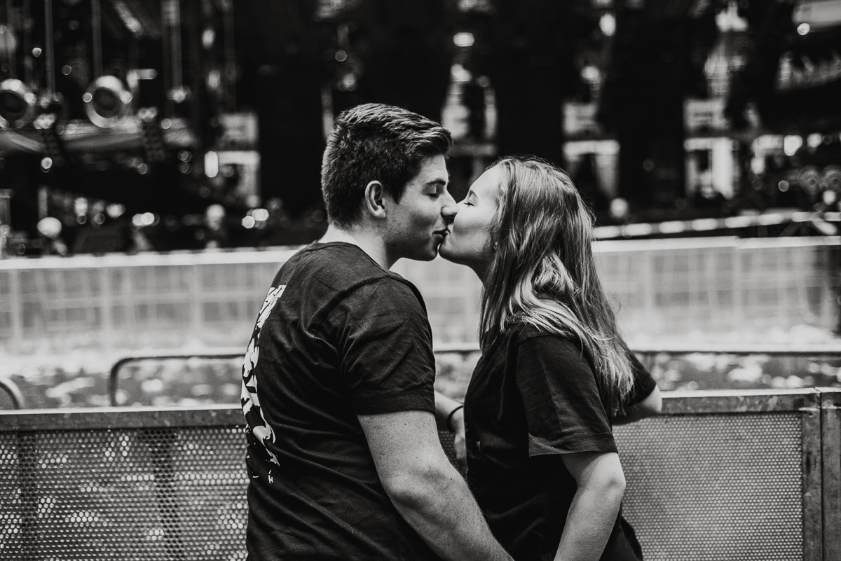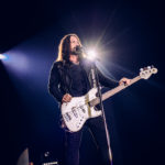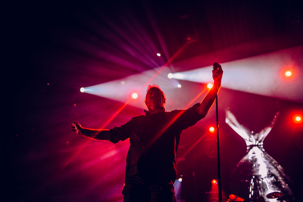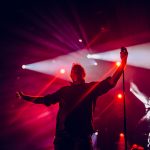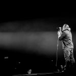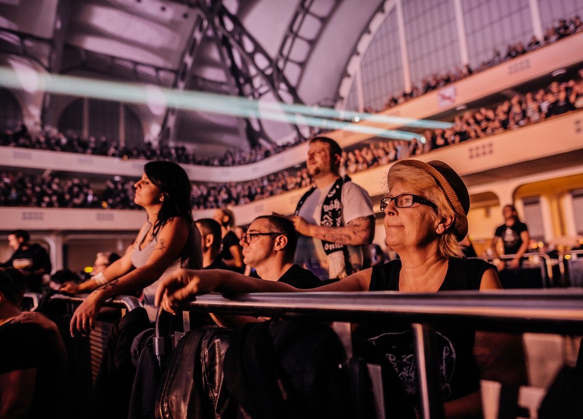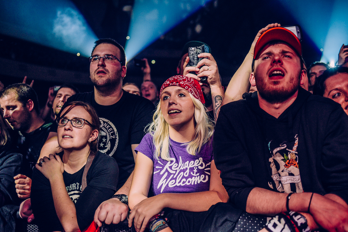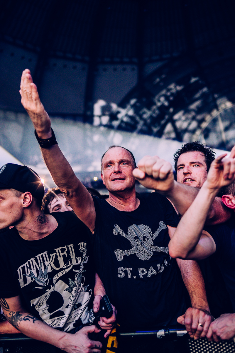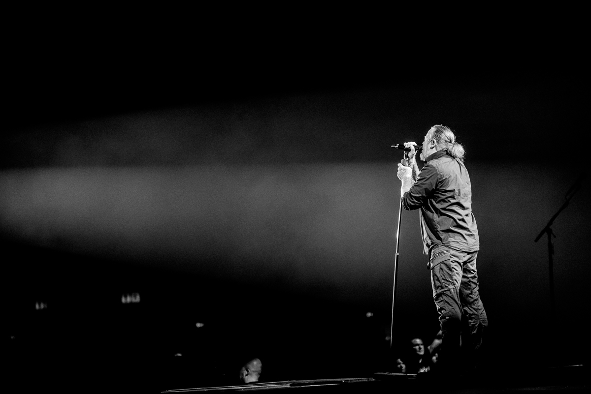 Im Anschluss daran mache ich mich, zusammen mit unserem Fotografen, Christian Thiele, auf den Weg durch die Ränge, um die – bereits gestern beschriebene – „Emotion des Moments“ einzufangen. Christian im Bild und ich im Wort. Unser Weg führt uns über den ersten Rang, wo wir auf ein älteres Pärchen treffen, was sich in den Armen liegt und den „Schutzgeist der Scheiße“ besingt, oder bekriegt. Ich glaube, letzteres. Die Bilder auf den Leinwänden, das Licht und die Schwere der gesungenen Zeilen, wirken wie ein Strudel und spätestens beim Solo sind beide ein Teil des Songs. So geht es vielen, glaube ich. Die Assoziation mag für jeden unterschiedlich sein – die Identifikation hingegen ist immer gleich. Wir gehen mal weiter…