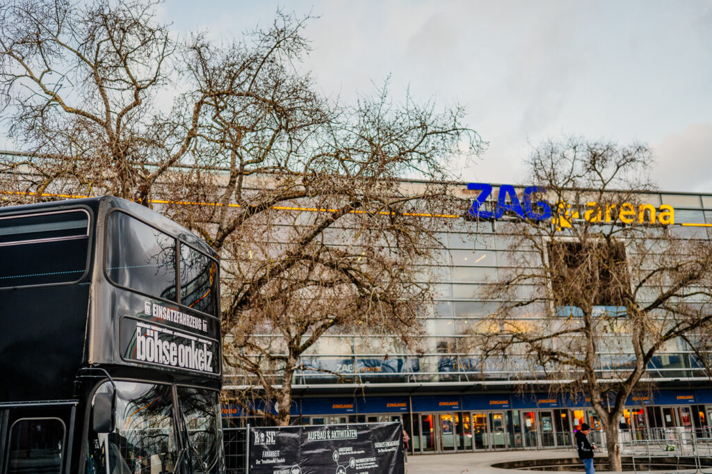 Hannover hat aber nicht nur weiße Unterhosen zu bieten, sondern auch zahlreiche schöne Lauf-/Fahrradstrecken und eine beachtliche Seenlandschaft in der Umgebung. Bei dieser Tour haben wir zum Start in Leipzig eine kleine Sportgruppe innerhalb der Crew gegründet, die von unserem Coach Robert angeführt wird. Robert hat für jede Stadt akribisch ein Städte- und Sportplan definiert, der unsere müden Körper während der Tour fit halten soll und den wir selbstverständlich ohne Widerspruch umsetzen, denn Robert kennt leider kein Erbarmen. Während Stephan also die Landschaft um Hannover, wie auch schon in Leipzig, mit dem Fahrrad erkundete, machten wir uns parallel auf einen Spaziergang zum Maschsee. Auf dem Plan stand heute die angenehmen 2 Grad Wassertemperatur für ein kleines Bad im See zu nutzen. Was noch zu Beginn der 5 Kilometer Wanderung wie ein lustiger Scherz anmutete, wurde mit jedem Kilometer zum bitteren Ernst. Soll ja schließlich gut fürs Immunsystem sein und auch den Kopf frei machen, redete ich mir ein. Nachdem wir diese Nahtoderfahrung, unter den verwirrten Blicken einiger Schaulustiger überstanden hatten, ging es für uns auf direkten Weg zur Halle und ins Büro. Bereits seit den frühen Morgenstunden hatten sich hier vor der Halle, wie bei jeder Onkelz-Tournee, einige hartgesottene Fans versammelt, um ihren Platz in der ersten Reihe zu sichern. Was im Sommer noch als spannendes Abenteuer durchgeht, wenn man bereits um 5 Uhr morgens vor der Halle gastiert, ist im Winter bei Minusgraden eine echte Tortour. Respekt und Anerkennung für jeden Einzelnen von euch!