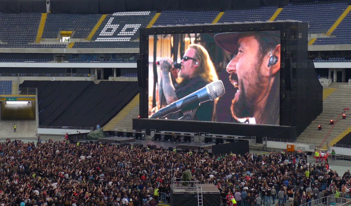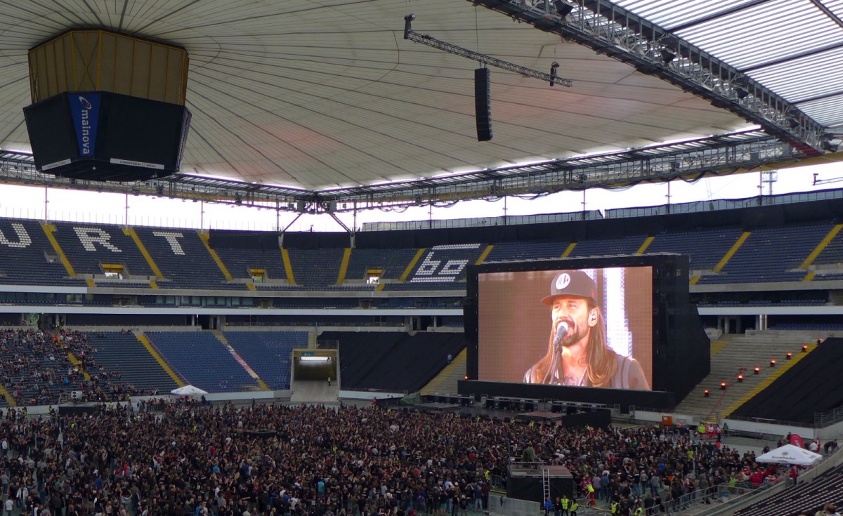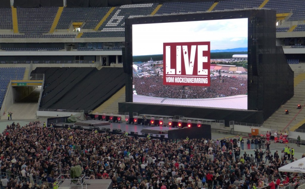 Dann wurde aus dem Gedanken, der anfangs noch recht skeptisch diskutiert wurde, Realität. Das Waldstadion sollte es werden. Kaum zu glauben, aber wahr: Bislang gab es noch keine offizielle BO Veranstaltung in diesem Schlachtschiff. Bis zum vergangenen Freitag. Public Viewing war angesagt. Das erste Konzert nach über neun Jahren sollte mit modernster Satelliten-Technik nach Frankfurt übertragen werden.