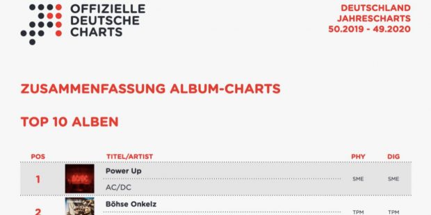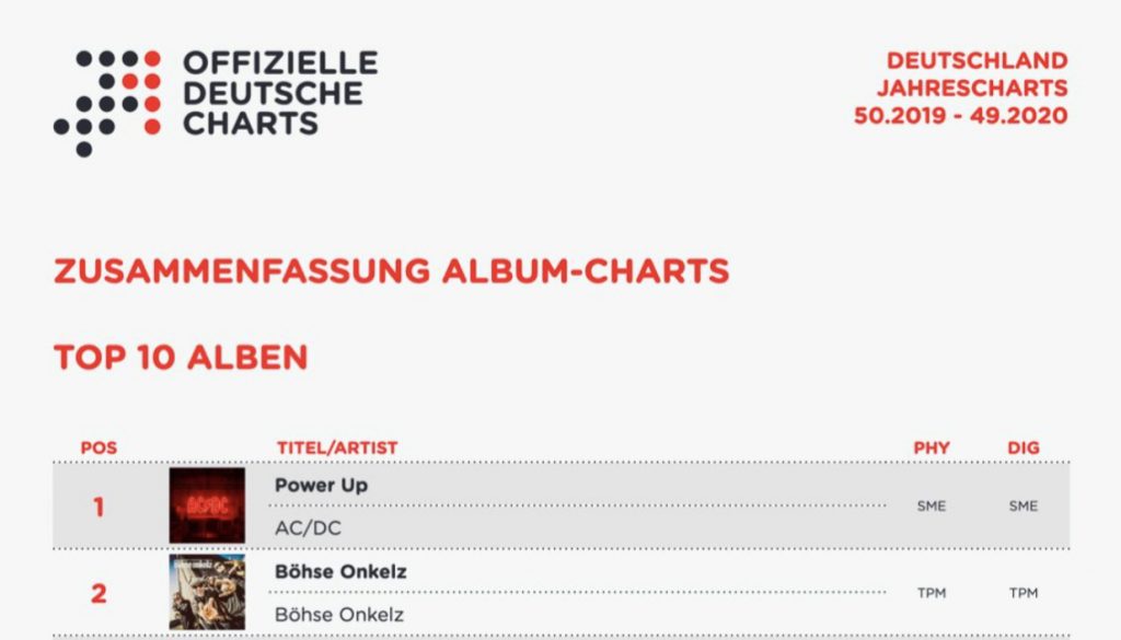 ist am 05. Dezember der verdiente Erfolg für „Böhse Onkelz“. Das (nach einhelliger Meinung eines großen Teils der Fanlandschaft) beste Onkelz-Album seit der VIVA LOS TIOZ wird in der Endabrechnung nur von AC/DC geschlagen und ist deshalb eigentlich die gefühlte Nummer eins 2020 in Deutschland.